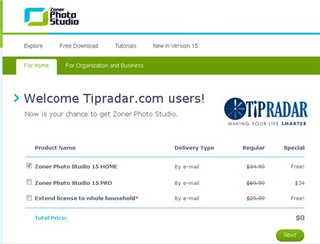 Bản quyền Zoner Photo Studio 15 Home có giá 34,99USD. Để nhận miễn phí, bạn truy cập địa chỉ sau, đánh dấu chọn mục Zoner Photo Studio 15 HOME rồi nhấn Next.